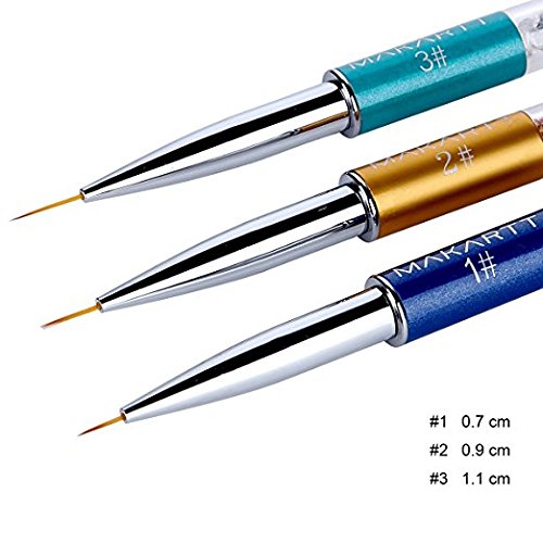 - 3pcsのネールライナーペンブラシ(サイズ異なる):パッケージには、異なる3つサイズが付属しています。3枚爪ライナーペン含まれています。それぞれは、1#7ミリ(ブルー)、 2#9ミリ(ゴールデン)、 3#11ミリ(シアン)です。ネールの上に、細かいラインや他のネールドローデザインに適している理想的なネールケアツールです。