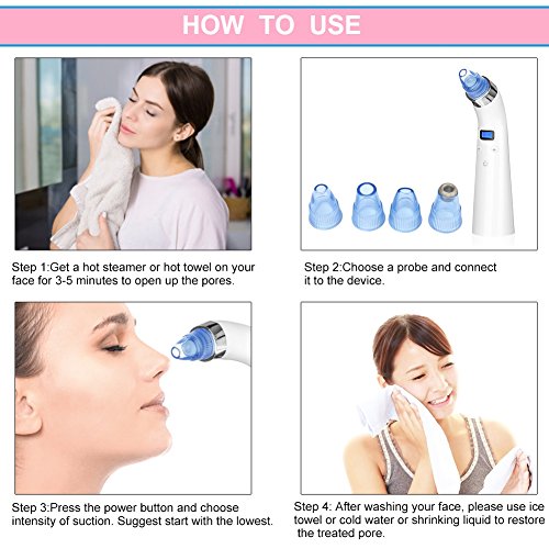 ✅5 STRENGHT SECTION & 4 REMOVABLE PROBES - This blackhead remover have 5 different strength & 4 different probes for your choose which is exactly designed for all kind of skin types.