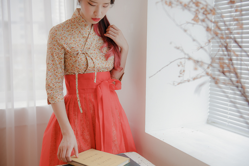 홍시색 한복원단 허리치마를 함께 코디해서 입으시는 꽃닮의 특별한 생활한복입니다.