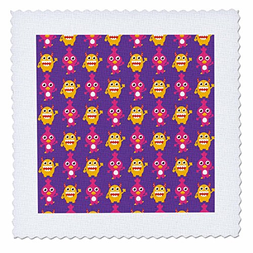 3dRose qs_113402_5 Cute Silly Yellow and Magenta Pink Monster Cartoons on Purple Background Pattern Graphic-Quilt Square, 14 by 14-Inch