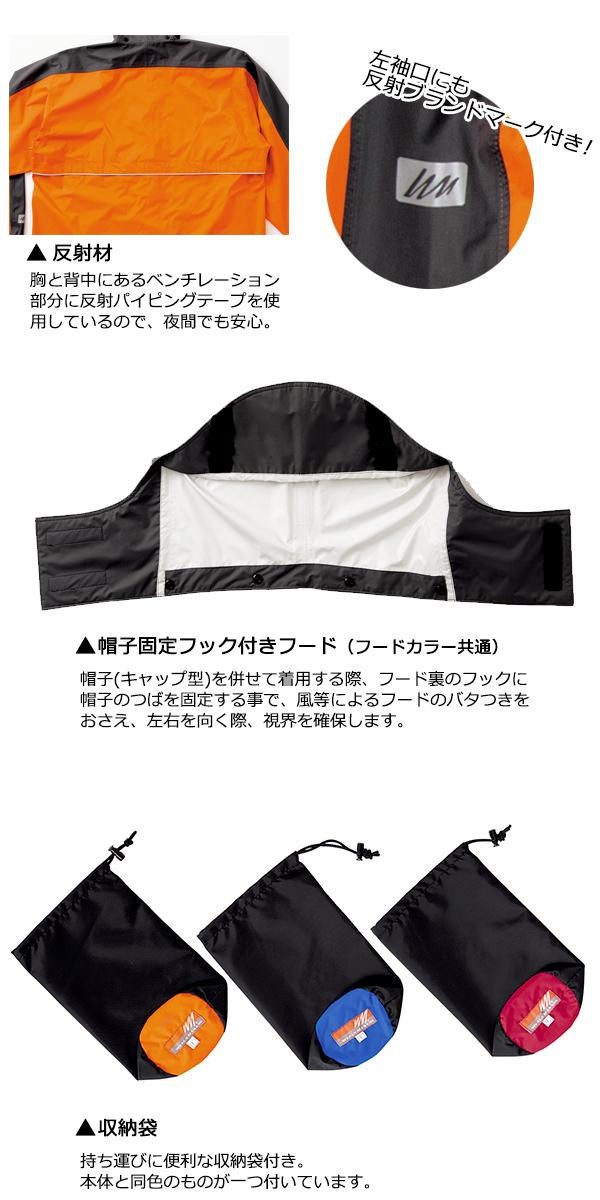透湿素材使用でムレにくく通気性抜群。袖口は面テープで絞りも調節可能です。袖口・胸・背中に反射材が付いておりますので、夜間でも安心です。フードは取り外すことができます。持ち運びに便利な収納袋付き。燃焼の際、有毒なガスを発生しない地球環境にやさしい低公害素材です。 |