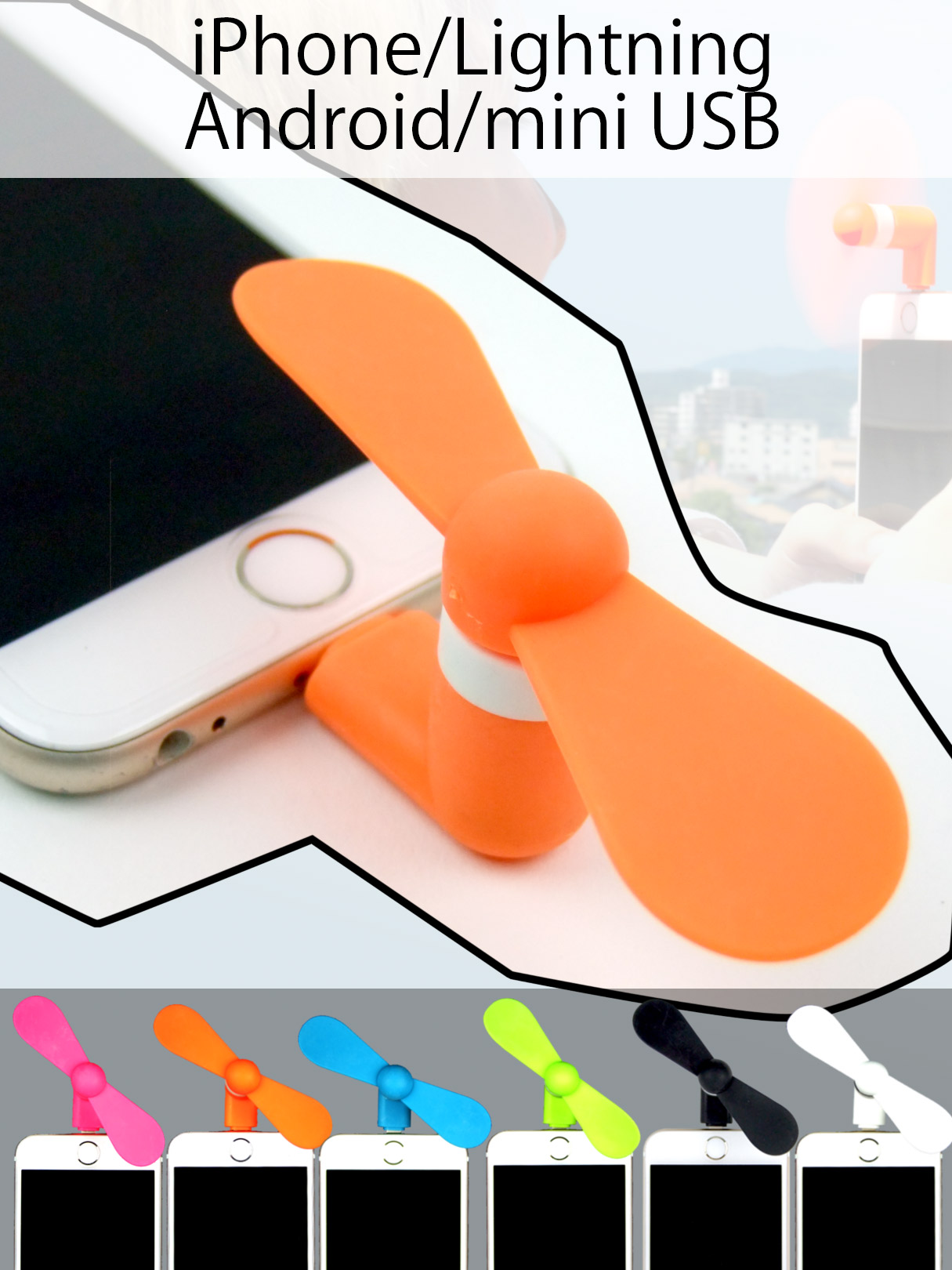 ◆携帯用扇風機◆「スマホ用 クールファン」暑い夏。キャンプやお祭りなど...暑くて仕方がないときに、手軽に、、、、、スマホにつなぐだけで! 心地いい風を受けられちゃう。 電源要らず、端子に差し込むだけなのでちょっとした場面でひょいっ!と使える。ポップなカラーでお使いの端末やケースなどに合わせられる、オシャレかわいいアイテムです!全6色※ご利用のモニター、ディスプレイにより若干色味に差がある場合がございます。ご了承ください。※商品の生産時における装飾等は手作業で行っており、多少の差異がある場合がございます。ご了承ください。
