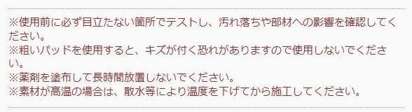 | 仕様 | 住宅用洗浄剤 液性:酸性 標準使用量:50~70g/m2 希釈:なし |