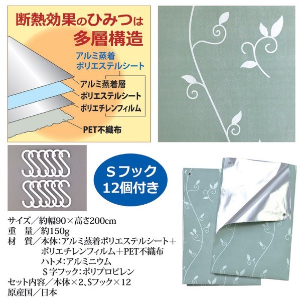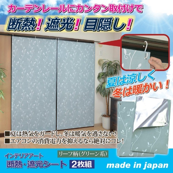 【商品名】断熱・遮光シート 【2枚組み/リーフ柄 グリーン】 1枚当り:幅90cm×高さ200cm Sフック付き 日本製 インテリアアート