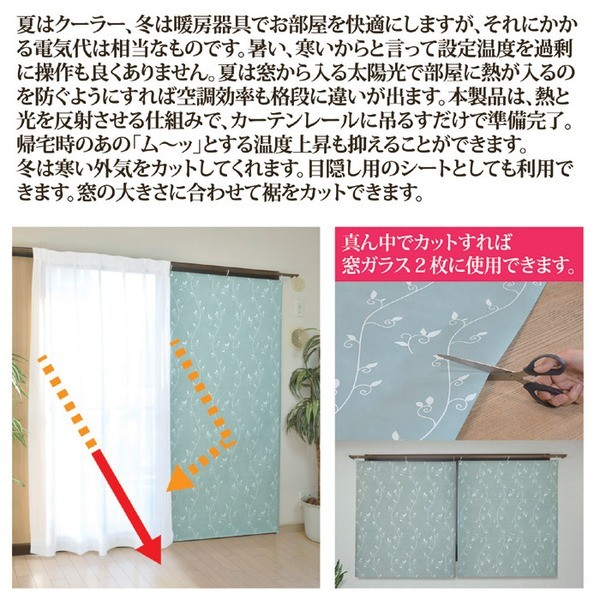 夏はクーラー、冬は暖房器具でお部屋を快適にしますが、それにかかる電気代は相当なものです。暑い、寒いからと言って設定温度を過剰に操作も良くありません。夏は窓から入る太陽光で部屋に熱が入るのを防ぐようにすれば空調効率も格段に違いが出ます。本製品は、熱と光を反射させる仕組みで、カーテンレールに吊るすだけで準備完了。帰宅時のあの「ム~ッ」とする温度上昇も抑えることができます。冬は寒い外気をカットしてくれます。目隠し用のシートとしても利用できます。窓の大きさに合わせて裾をカットできます。