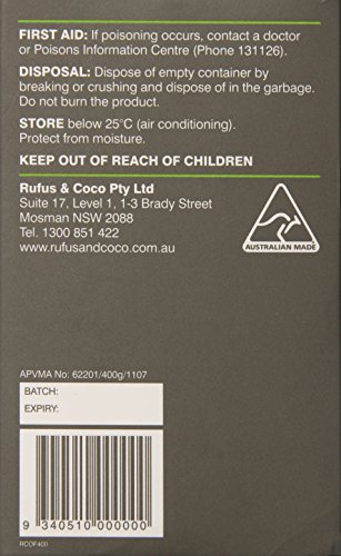 -. Binding : Misc. -. Brand : Rufus and Coco -. Department : ToysAndShoes -. EAN : 9340510000000 -. Feature : Helps in the aid of digestive problems / Aids bad breath / Tightens stool / Mix with your pet's food or water -. Label : Aussie Inc. -. Manufacturer : Aussie Inc. -. Model : RCOF400 -. MPN : RCOF400 -. NumberOfItems : 1 -. PackageQuantity : 1 -. PartNumber : RCOF400 -. ProductGroup : Pet Products -. ProductTypeName : PET_SUPPLIES -. Publisher : Aussie Inc. -. Studio : Aussie Inc. -. Title : Rufus and Coco Odor Fender