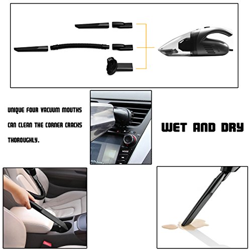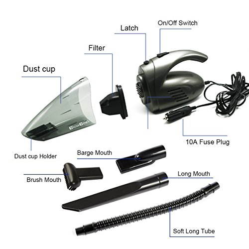 -. Feature : ELECTRIC CORD&SUCTION---Brand: GlowGeek ,12-Volt,Power:80W, Suction 3.2KPA handheld vacuum cleaner; Keeps the filter clean and suction power constant, Can Vacuum dry normal Garbage,4 meters(13.2-foot power cord). / Four Vacuum Mouths INCLUDING---We put the four vacuum mouths, the short brush mouth is to vacuum the hair and wool fabric, the barge mouth to vacuum the surface dust, The soft long tube and the straight long mouth is to vacuum the deep garbage. The One-step empty means hands never touch the dirt, Fingertip on/off control;1-step emptying system. / Wet/Dry/Vacuum Water Function Handheld Auto Car Vacuum Cleaner---This Car Vacuum Cleaner have Wet/Dry Function, you can use our Car Vacuum Cleaner to vacuum the water, but there is a "MAX" water location, your water cannot over the MAX location, It is very useful. / Long Soft Tube and Environmental protection Cloth Bag---We also put a long Vacuum mouth, which help you to Vacuum Clean for the deep dust. The Measures for the soft long tube approximately 18.2 inches; It is easy to vacuum the deep and hidden garbage. We also put an environmental protection cloth bag to protect the vacuum Cleaner. / Any question,please email us,we response you within 24 hours and provide technical support.we provide 1 YEAR QUALITY GUARANTEE,WE WILL GIVE YOU REFUND OR SEND YOU REPLACEMENT IF YOU ARE NOT SATISFIED WITH OUR PRODUCT