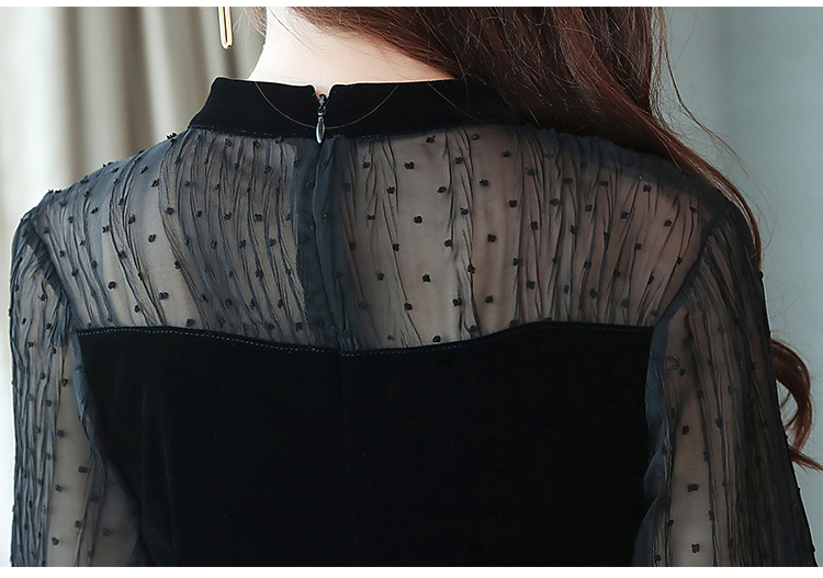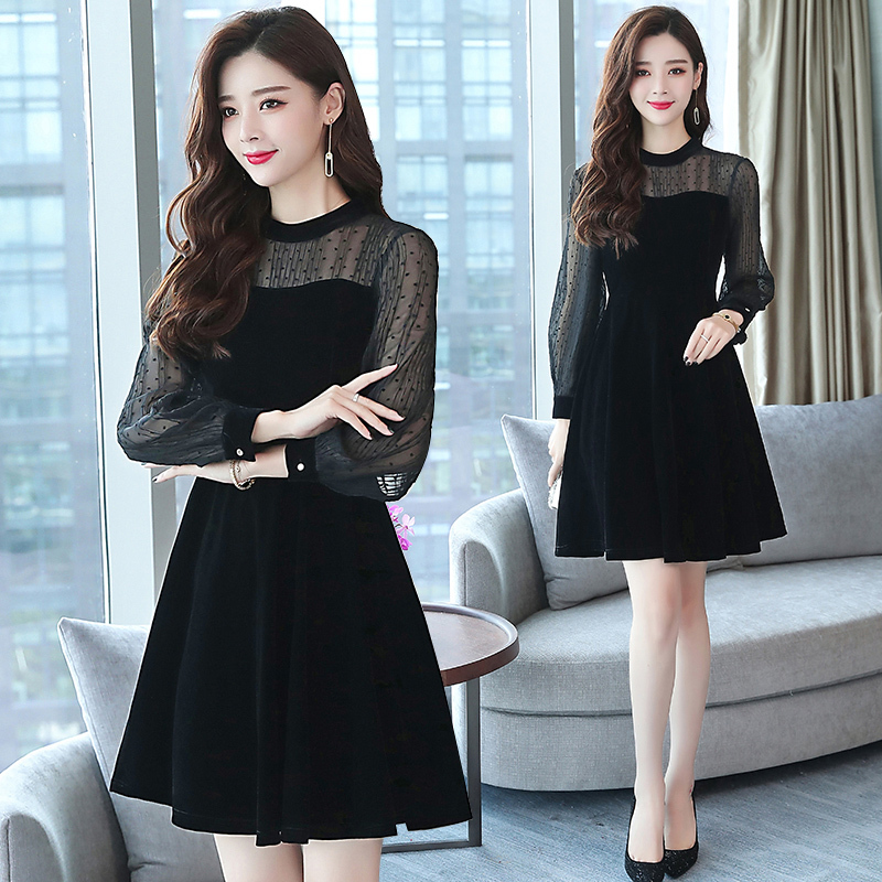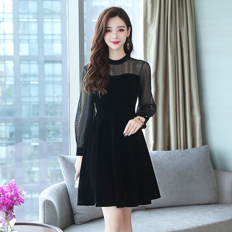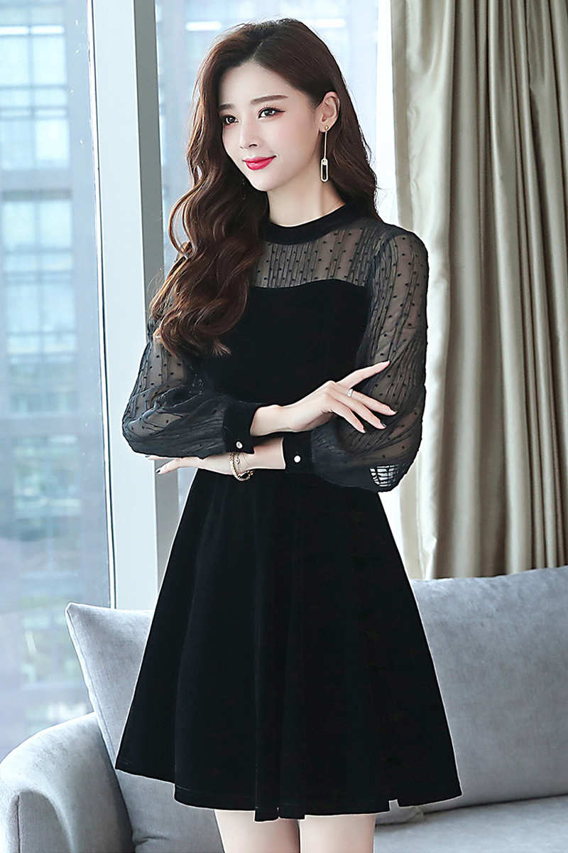 パーティードレス ワンピース レース 長袖 ショート丈 ミッドウエスト ラウンドネック シースルー