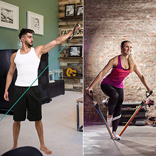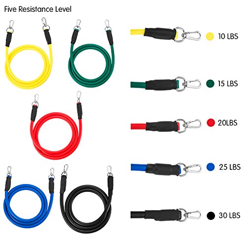 The 11 piece kit includes 5 resistance bands (10Lbs-30Lbs) for a total resistance of 100 Lbs, 2 Soft Foam Handles, 2 Neoprene Ankle Straps, 1 Durable Door Anchor A Convenient Carrying Bag