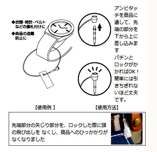 | 衣類・ベルト・時計などの値札付け及び商品の盗難防止に、最適です。値札や商品をアンビタッチに通し、両端を合わせて留めるだけのワンタッチ操作で、簡単にしっかりロックできます。 |