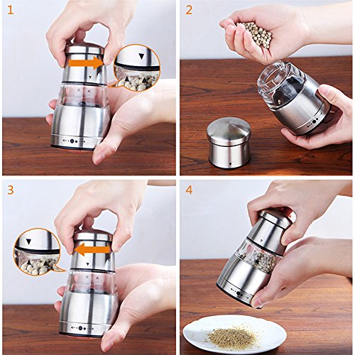 - SIMPLE AND EASY TO USE: Screw on left triangle to open the lid, fill with pepper or salt and shake well, screw on right triangle to cover the lid, clockwise rotate the grinding head. Turn "+" to grind coarse grains, turn "-" to grind fine grains. Operation is simple. NO INSTRUCTIONS REQUIRED!