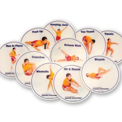 -. Feature : Set up 10 exercise stations quickly and easily with these highly visual spots / 8 1/dia. X 1/8 inch ; thick stations feature vivid printing on an anti-slip rubber material - activity guide included / Manufactured in China