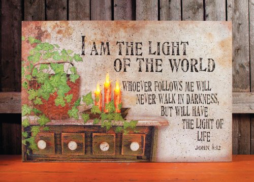 Custom designed wall art from Ohio Wholesale is the answer to all of your home decor and unique gift needs. Our Radiance Lighted Canvas Wall Art with Light Of The World is printed on canvas and lights up with LED lights for a dramatic statement (requires 2 AA batteries, not included). Easily hung by attaching the saw tooth hanger. This uplifting piece reads "I am the light of the world, whoever follows me will never walk in darkness but will have the light of life". Family owned and designed in the US, Ohio Wholesale has been satisfying customers with our quality and service for over 35 years. Decorate your life with treasures from Ohio Wholesale.Feature
