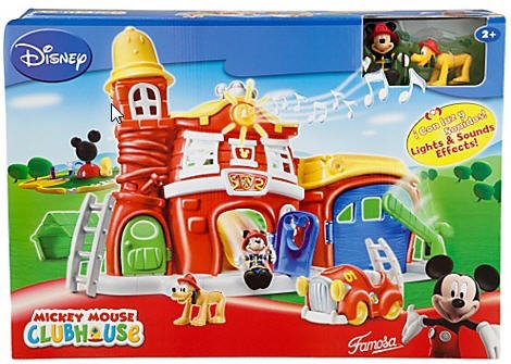 -. Binding : Toy -. EAN : 0681131739283 -. Feature : Poseable Fireman Mickey and Pluto figures / Press down on bell for light and sound effects, Press Helmet steeple for squeaking sound / Garage and Fire Station Doors open, Mickey Mouse Fire Truck with movable ladder / •Helmet opens up so you can drop figures on to slide, Press down on Bed for snoozing sound effects with three levels / Fire Station measures 15'' H x 21'' W (open) x 9'' D, Ages 2+ -. Label : Disney -. Manufacturer : Disney -. ProductGroup : Toy -. ProductTypeName : TOYS_AND_GAMES -. Publisher : Disney -. Studio : Disney -. Title : Mickey Mouse Clubhouse Lights & Sounds Fire Station Playset with Mickey & Pluto Figures -. UPC : 681131739283