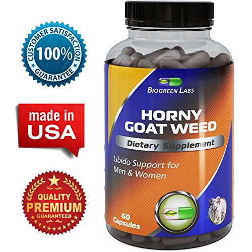 -. Feature : NATURAL LIBIDO ENHANCER - Herbal extract capsules are a unique combination of several herbs. Horny Goat Weed is an ultra potent libido booster and enhancer for both male and female. Works with your body to create faster full body arousal - enhanced sensitivity through improved health flow. Horny Goat Weed regulate energy levels + sooth stressed muscles. A healthy dosage keeps nitric oxide up. A healthy flow and relaxed muscles contribute to intensified sensations and mental alertness. / FOR MEN AND WOMEN - Horny Goat Weed has been used to boost desire by people in China for many generations. It's a reliable herbal aphrodisiac for both men and women. Enhance your libido with this time-tested natural supplement! / #1 EXTRACT WITH MACA ROOT POWDER - This is a natural supplement with zero fillers. Capsules crafted from highest quality of organic herbs. Infused with Maca root powder + l arginine + yohimbine + ginseng + pure icariin + tongkat ali root powder + L-arginine + gaia + gh-2 and other herbs, making this a potent aphrodisiac! Rich in dietary minerals, calcium, and potassium - it also contains essential trace elements of iron, iodine, copper, manganese, and zinc, as well as fatty acids including linolenic acid, palmitic acid, and oleic acids, and 19 amino acids. / MANUFACTURED IN A GMP CERTIFIED FACILITY - Biogreen Labs is one of the largest manufacturers of naturally sourced supplements in the USA. Highly dependable, our FDA-evaluated facilities are strictly adherent to GMP guidelines and standards. As a company dedicated to providing health and wellness, our products use only the best ingredients. We do not support the use of flow agents, binders, and other harmful additives. Buy now knowing that you will receive the quality product our company is proud to offer. / 100% MONEY-BACK - We are so confident you will love our low cost natural supplements that if you are not 100% satisfied, we will be pleased to refund you every last penny easily. Purchase now before our stock runs out knowing that we are here to make you happy no matter what. When implemented into your diet as directed, Horny Goat Weeds top quality pills that give you quick results that work fast! We are certain that you will love our best Horny Goat Weed with Maca Root blend. What do you have to lose? BUY NOW!!