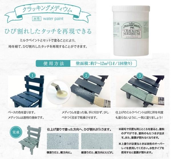 (クラッキングメディウム) ※上塗りが必要なときは油性のオーバーレイを使用して下さい。水彩タイプを使用すると塗膜が割れます。