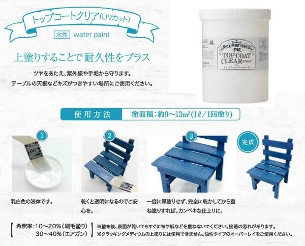 (トップコートクリア・UVカット) ※塗布後、表面が乾いてもすぐに布や紙などを重ねないでください。接着の恐れがあります。 |