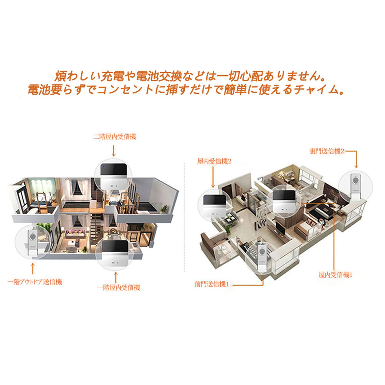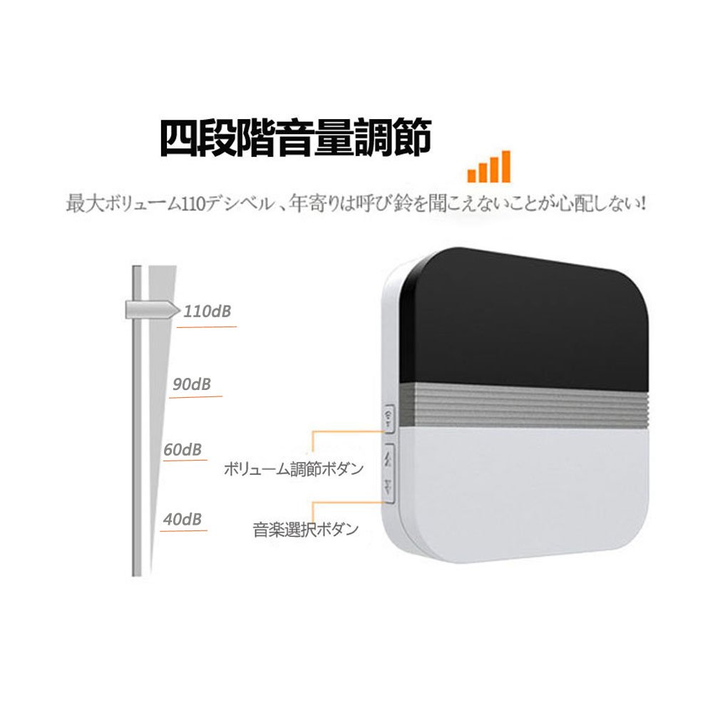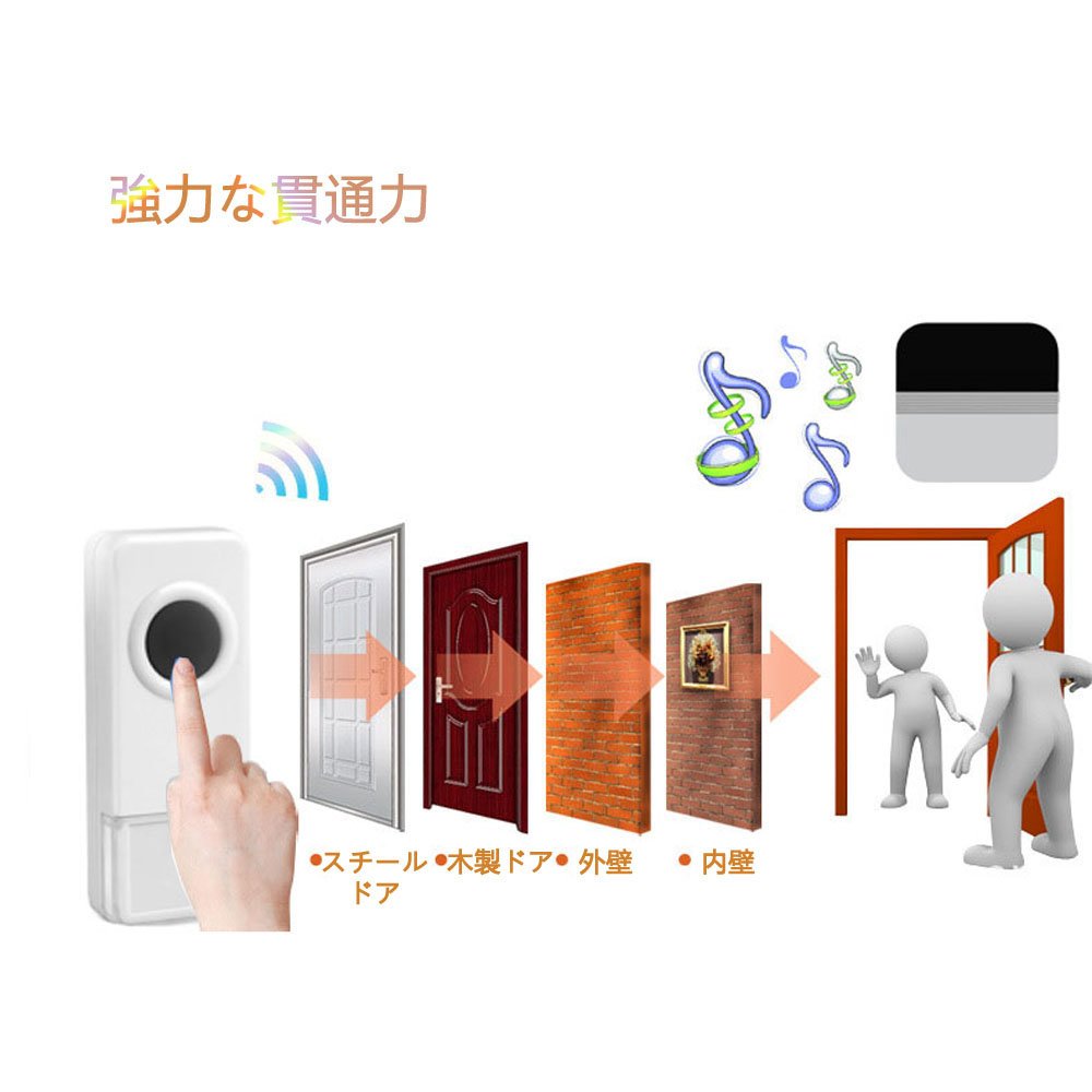 It is a wireless chime that can be easily installed without wiring as a call chime at entrance chime, separate chime, guest chime, nurse call, nursing care site, restaurant, warehouse and so on.