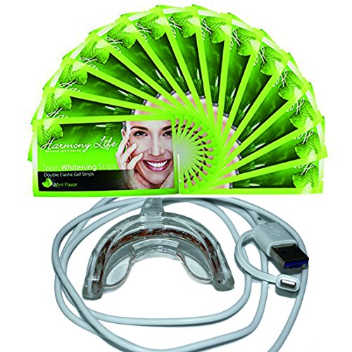 -. Feature : Teeth whitening light accelerator light enhances Harmony Life teeth whitening strips process to break down stains on the teeth surface,whiten faster / Offer 3 In 1 Adapters & Ports for IPhone,Android,USB,Never worried about the light running out of energy / 3 in 1 Multiple LED light can work with other brands teeth whiteninig gel or strips(for example Harmony Life teeth whitening strips), dones not need a tray as this unit IS the tray / 14 pouches of 2 strips total of 28 strips, use twice 15-minutes sessions a day / Package includes 16 LED teeth accelerator light that speeds up teeth whitening process