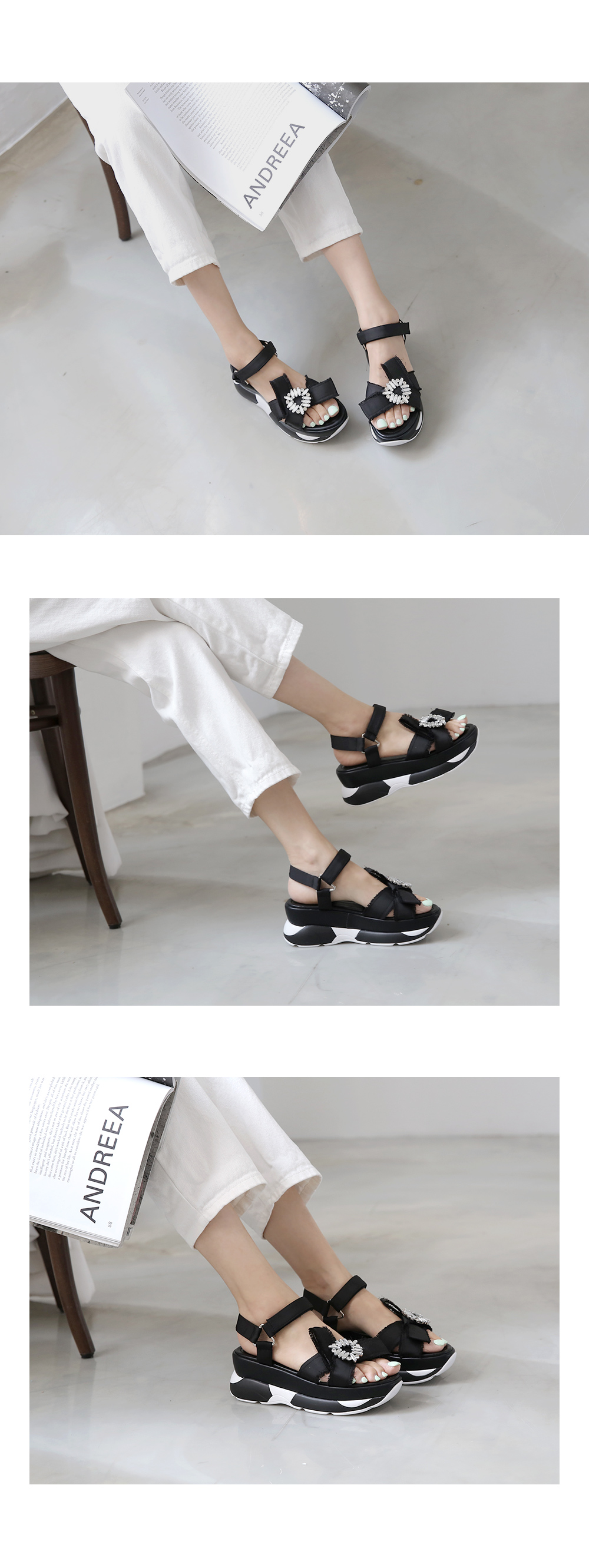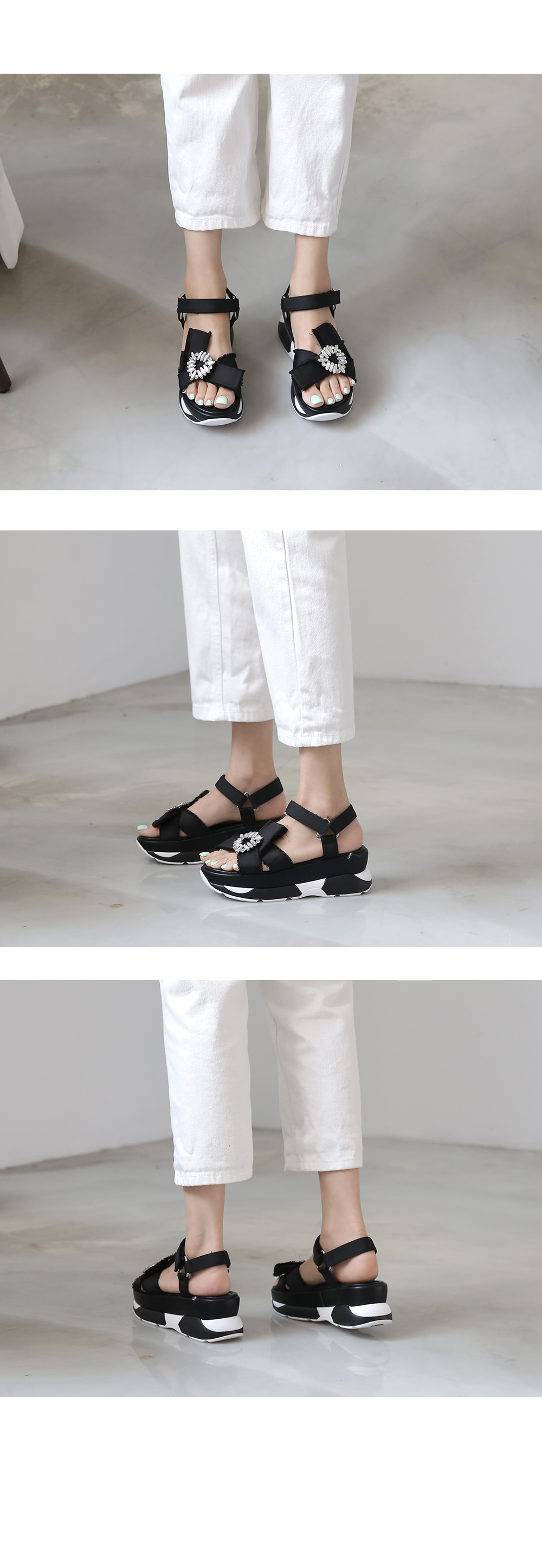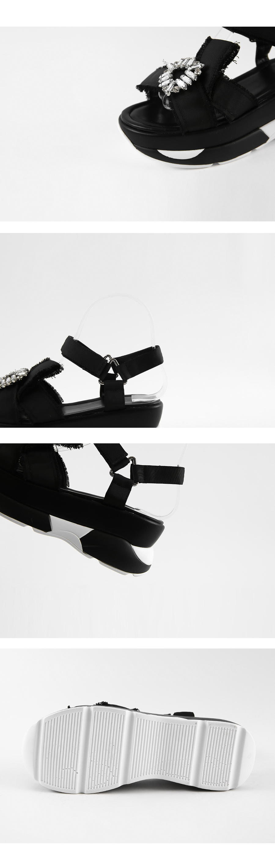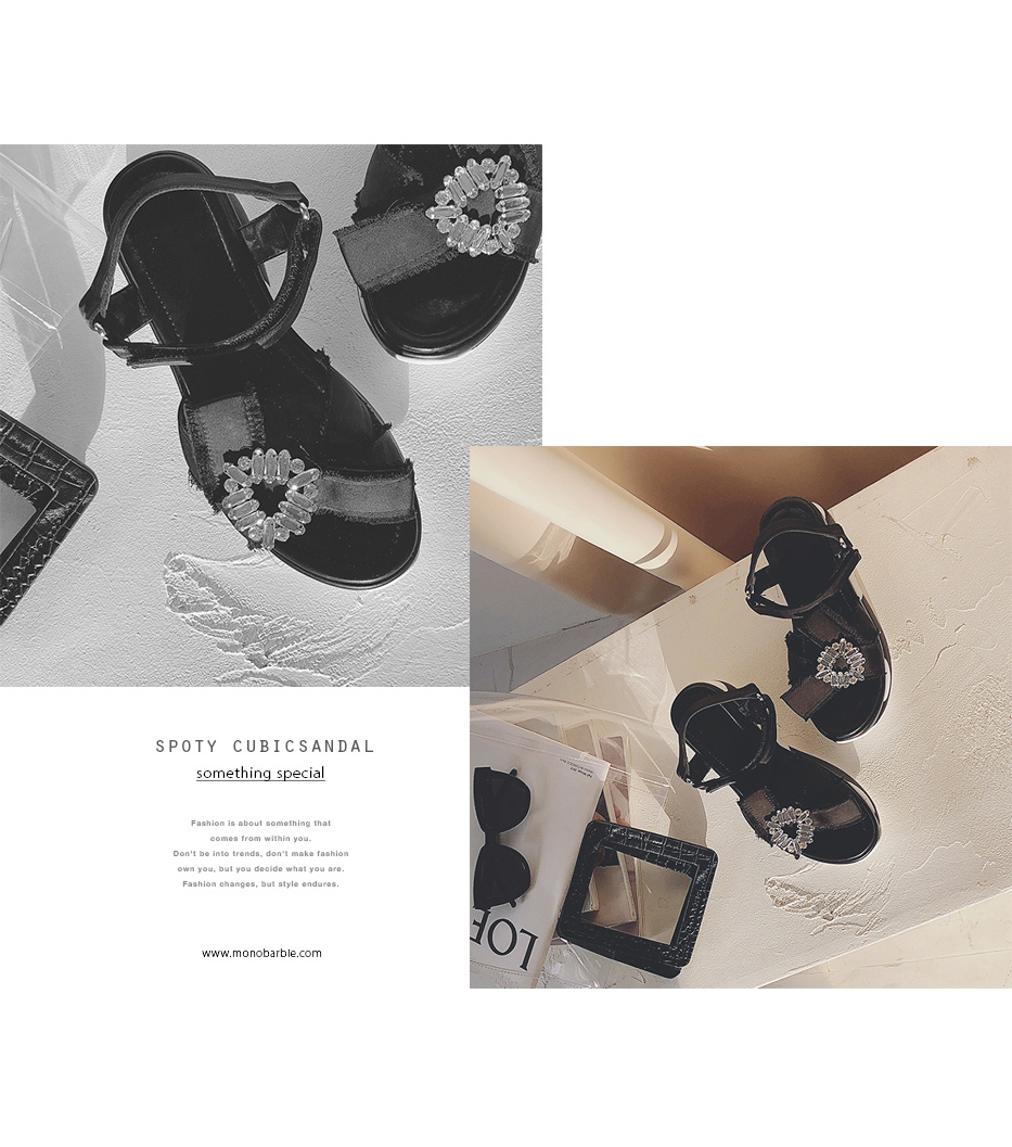 런닝화를 신은듯 나른하면서도 안정감있는 착화감 느껴지는 아웃솔이 특징인 스포티샌들로 발등에 볼드하게 걸린 큐빅디테일이 근사합니다.