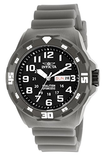 The Coalition Forces watch by Invicta is perfect for any athletic man This watch is made with a silicone band and plastic case These long-lasting materials guarantee extended use of the product and a satisfied owner The grey band black dial and silver hands add to the tough exterior This piece is also crafted with a sturdy mineral crystal to protect the dial and is powered by a Japanese quartz movement to ensure you are always covered Additionally this product is water resistant up to 100 meters 330 feet 10 atm which is ideal for those who enjoy water sports The durable hardware and unmatched quality of the Coalition Forces watch by Invicta will help you accomplish anything you put your mind toFeature