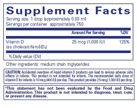 Pure Encapsulations vitamin D3 liquid provides 1,000 I.U. per drop, an ideal daily amount. For individuals with greater short-term needs, this product allows for achieving 25,000-50,000 I.U. vitamin D3 per week without having to take multiple capsules.
