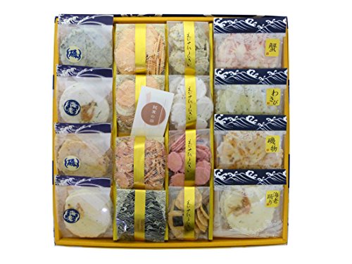 内容量:16個(わかめせん(4枚)1個、ごもくわさび(18g)1個、大満月(4枚)1個、夕月(15g)1個、たこせん(5枚)1個、小梅(20g)1個、特えび(5枚)1個、のり松風(14g)1個、磯味(26g)1個、かに(3枚)1個、小花丸(17g)1個、わさび(3枚)1個、かにえびせん(25g)1個 漁火(3枚)1個、いかすみソフト(25g)1個、えび踊り(3枚)1個)