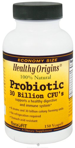 Healthy Origins Probiotic 30 Billion CFU Description: Supports a healthy digestive and immune system 8 strains and 30 billion colony forming units No refrigeration required Stomach acid resistant Healthy Origins Probiotic 30 Billion CFU's is a powerful blend of 8 friendly bacteria strains and 30 billion colony forming units (CFU's) which can help support a positive balance of micro flora in the intestines. Supplementing with probiotics may help to restore and maintain friendly bacteria colonies that were depleted by stress antibiotics and gastrointestinal disturbances. Healthy Origins Probiotic 30 Billion CFU's is stomach acid resistant to ensure that the maximum amount of friendly bacteria reach the intestinal tract to exert their greatest benefits. Probiotic 30 Billion CFU's is stable at room temperature. Refrigeration is not required. Amount Per Capsule Blend of 8 probiotic strains 30 Billion CFU's Lactobacillus acidophilus 12 Billion CFU'sBifidobacterium lactis 12 Billion CFU'sLactobacillus casei 1 Billion CFU'sBifidobacterium breve 1 Billion CFU'sLactobacillus salivarius 1 Billion CFU'sLactobacillus plantarum 1 Billion CFU'sBifodobacterium longum 1 Billion CFU'sLactobacillus rhamnosus 1 Billion CFU's Free Of Sugar salt yeast wheat starch corn fish shellfish nuts tree nuts and egg. Disclaimer These statements have not been evaluated by the FDA. These products are not intended to diagnose treat cure or prevent any disease.Ingredients : Vegetable capsule (cellulose water) microcrystalline cellulose vegetable magnesium stearate silicon dioxide. No sugar salt yeast wheat starch corn fish shellfish nuts tree nuts or egg. Contains minimal residual amounts of dairy soy and gluten peptides which are used the fermentation process.Gluten Free : YesYeast Free : YesWheat Free : YesSize : 150 VCAPPack of : 1Product Selling Unit : each