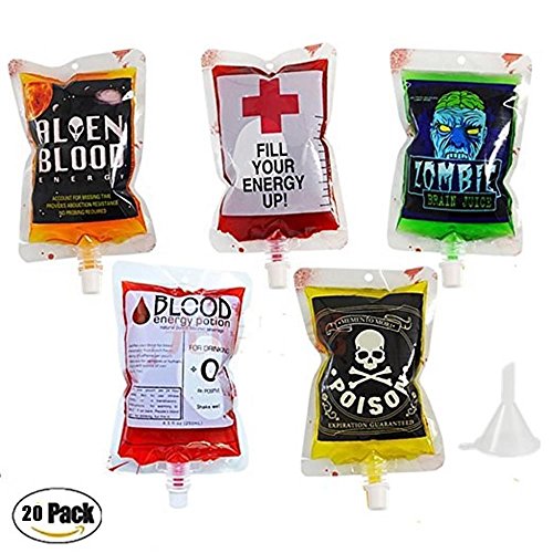 Halloween Party Drinking Blood Bag -AQUEOUS 250ML 8.5oz 20 Pack with Funnel Reusable Drink Container for "Blood" of Theme Parties (20 Pack 5 Pattern)