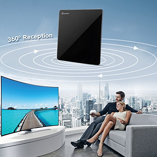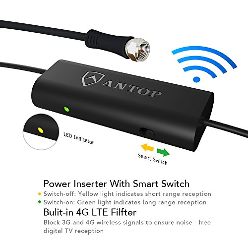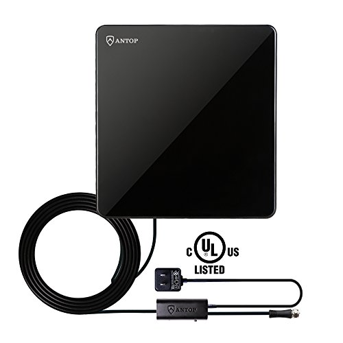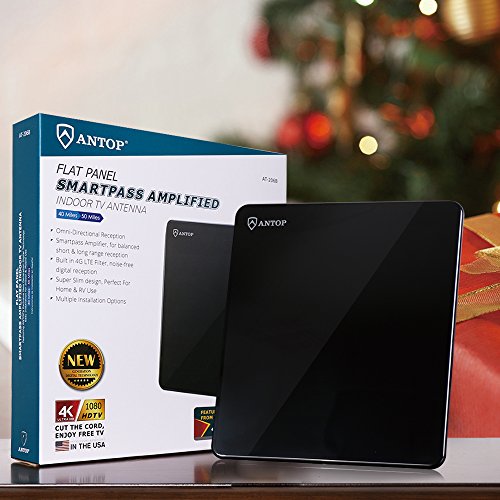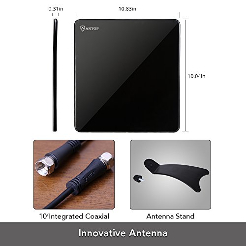 ANTOP Flat-Panel Indoor HDTV Antenna with High Gain Smartpass Amplifier and built in 4G LTE Filter, OTA External HDTV Antenna - AT-206B Range: 40 to 50 miles from point of signal origination Power Supply: DC 5V Reception Pattern: Omni-directional Polarization: Horizontal/Vertical Color: Piano Black Size: 10.04x10.83x0.30in Coaxial Cable: 10ft Integrated Exclusive Technology: Smartpass Amplifier, Built in 4G LTE Filter Smart Switch On: Long range reception Smart Switch Off: Short range reception Support:VHFUHF