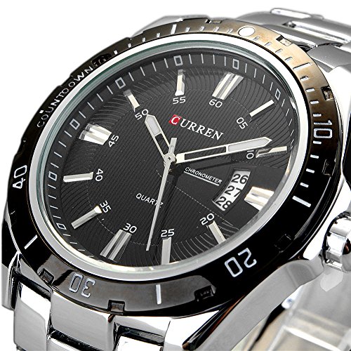 -. Feature : All steel material strap quartz wrist watch for men. / High hardness glass mirror, scratch and wear resistant. / Unique calendar window design, make the the watch unique. / Imported Japan quartz movement, keep precise time. / 3AMT waterproof.