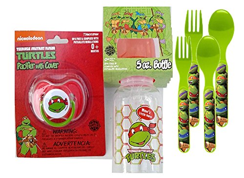 -. Feature : These 5. oz bottles are the perfect size to use when you are on the go. It is not bulky, it saves space and is a convenient size for your little one's cute and delicate hands. / The Pacifier is a must have when you are on the go. Just put it in your babies bag and grab as needed. You cant go out and not have a pacifier is a must. Entertain your little one with Teenage Mutant Nina Turtles pacifier. The vivid Red will call your baby's attention and prevent him/her from crying. 0+ Months / Ninja Turtles 4pc Flatware Set Includes 2 forks and 2 spoons! Colors may come assorted between green & blue. / BPA free & Complies with Phthalate Regulations.