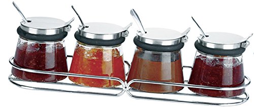 Decorative set includes4 clear glass cruets and a stainless steel stand that is the perfect compliment for presentation.Bring a modern touch to your kitchen or dining room with this convenient cruet set. Cruets come with a see through glass for easy viewing and refilling. Perfect gift for Christmas, a birthday, holiday gift, or a simple just because gift.