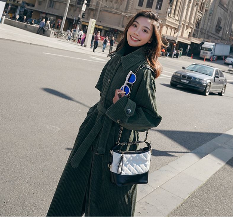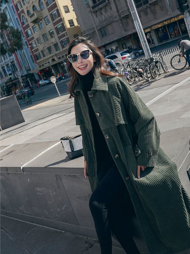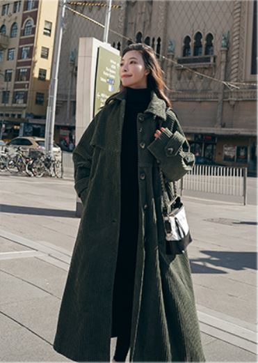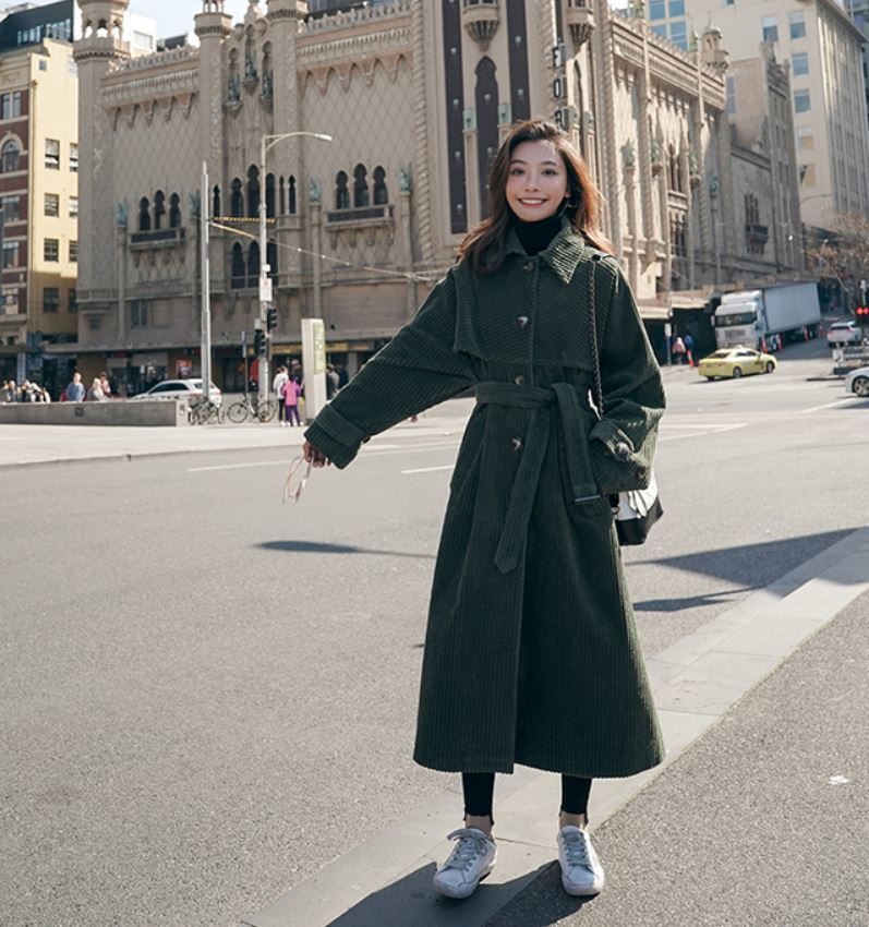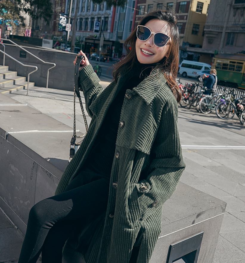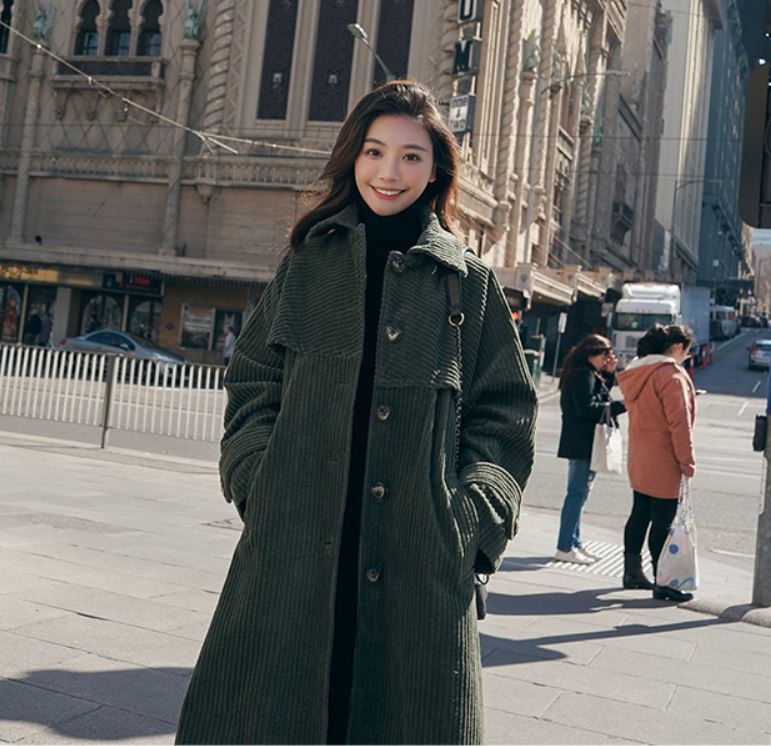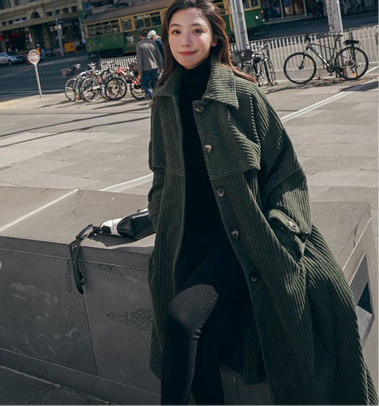 冬にピッタリなモスグリーンのコーデュロイ生地が可愛いロング丈のコート♪