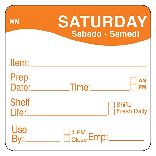 - The day of the week is printed in English, Spanish, and French for multilingual kitchens