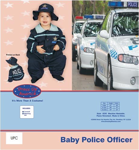 -. Binding : Apparel -. Brand : Dress Up America -. Color : Blue -. Department : unisex-baby -. Feature : Product comes complete with, jumpsuit coverall and matching hat / Outfit closes with snaps for easy diaper changing / Set packaged in durable snap-sealed poly bag -. Genre : Career -. Label : Dress Up America -. Manufacturer : Dress Up America -. Model : 295 -. MPN : 295-12M -. NumberOfItems : 1 -. PackageQuantity : 1 -. PartNumber : 295-12M -. ProductGroup : Apparel -. ProductTypeName : BABY_COSTUME -. Publisher : Dress Up America -. Size : 9-12 Months -. Studio : Dress Up America -. Title : Dress Up America Baby Police Officer Costume