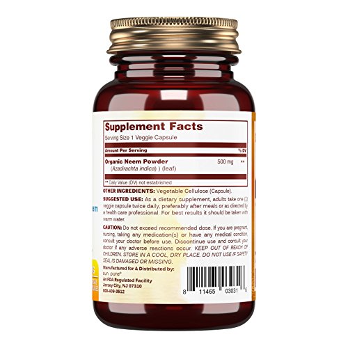 -. Binding : Health and Beauty -. Brand : Sun Pure -. EAN : 0811465030316 -. Feature : GENUINELY NATURAL PRODUCTS Sun Pure offers meticulously crafted products from the heart of India. Every ingredient that goes into making our products is carefully hand-picked to ensure you get the best that mother-nature has to offer. / HOLISTIC APPROACH We are committed to bringing you products that promote and support the true wellness of your whole body and mind. / Neem is a tree with an incredible variety of beneficial properties. The Neem tree originates from India and plays a key role in Ayurveda (the oldest Indian holistic healing tradition). Neem is known for its high concentrations of active ingredients that exert Neem's healing and protective properties. / At Sun Pure we believe great health begins with great nutrition and a balanced lifestyle. We offer the best dietary supplement 'under the sun!' to help you live a healthier life. All our products are manufactured in accordance with Good Manufacturing Practices (GMP), among the highest standards in the world. / All Sun Pure products are proudly made in USA with Guaranteed Purity & Potency. All our products are Third Party Tested to ensure purity and potency! -. IsAdultProduct : 0 -. Label : Sun Pure -. Manufacturer : Sun Pure -. ProductGroup : Health and Beauty -. ProductTypeName : HEALTH_PERSONAL_CARE -. Publisher : Sun Pure -. Studio : Sun Pure -. Title : Sun Pure Premium Quality Organic Neem 500 mg Veggie Capsules Glass Bottle -120 Count -Traditional Ayurvedic Herb -Supports Healthy Immune Function -Promotes Digestive Health -. UPC : 811465030316