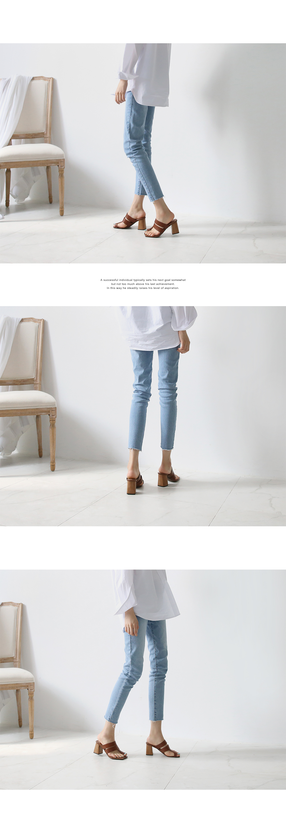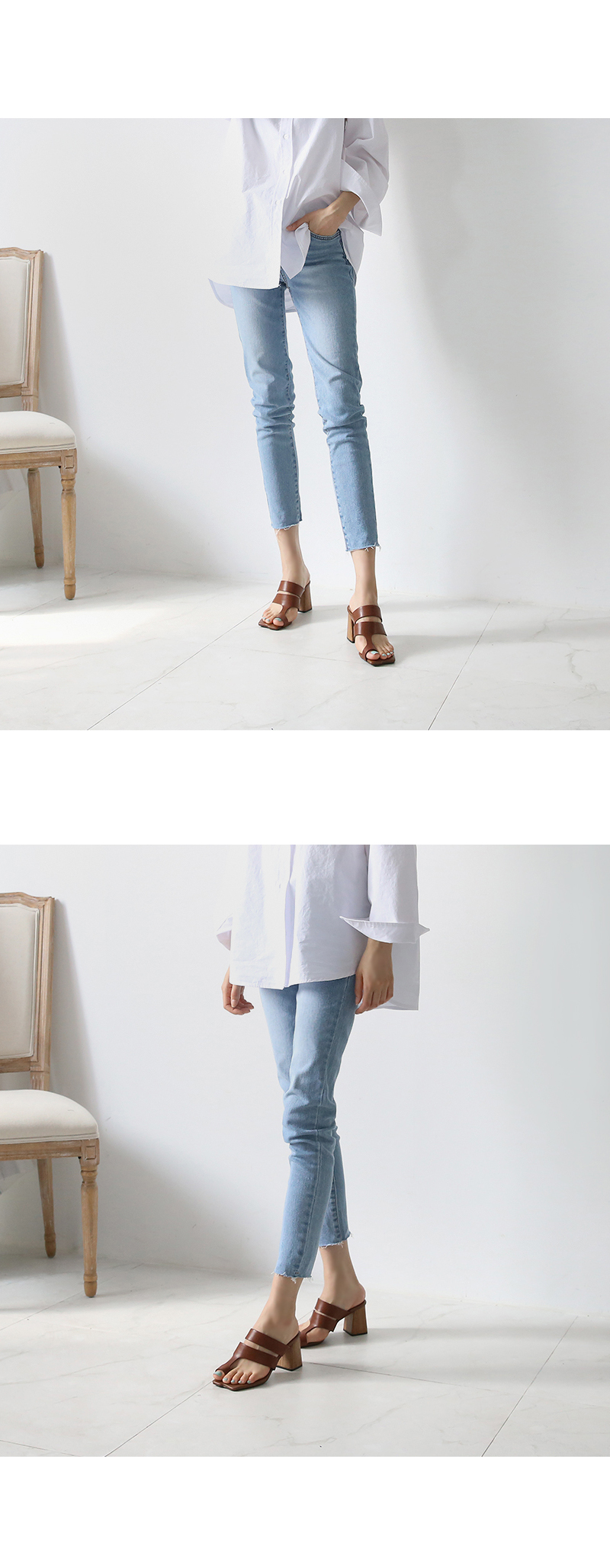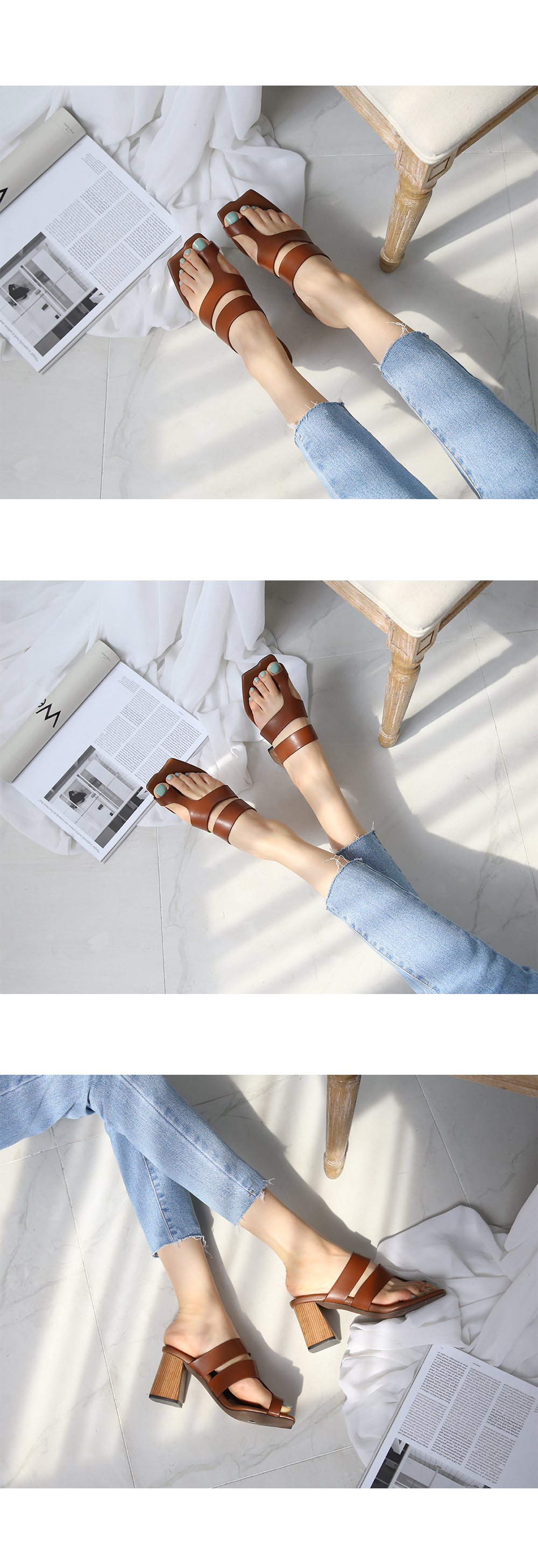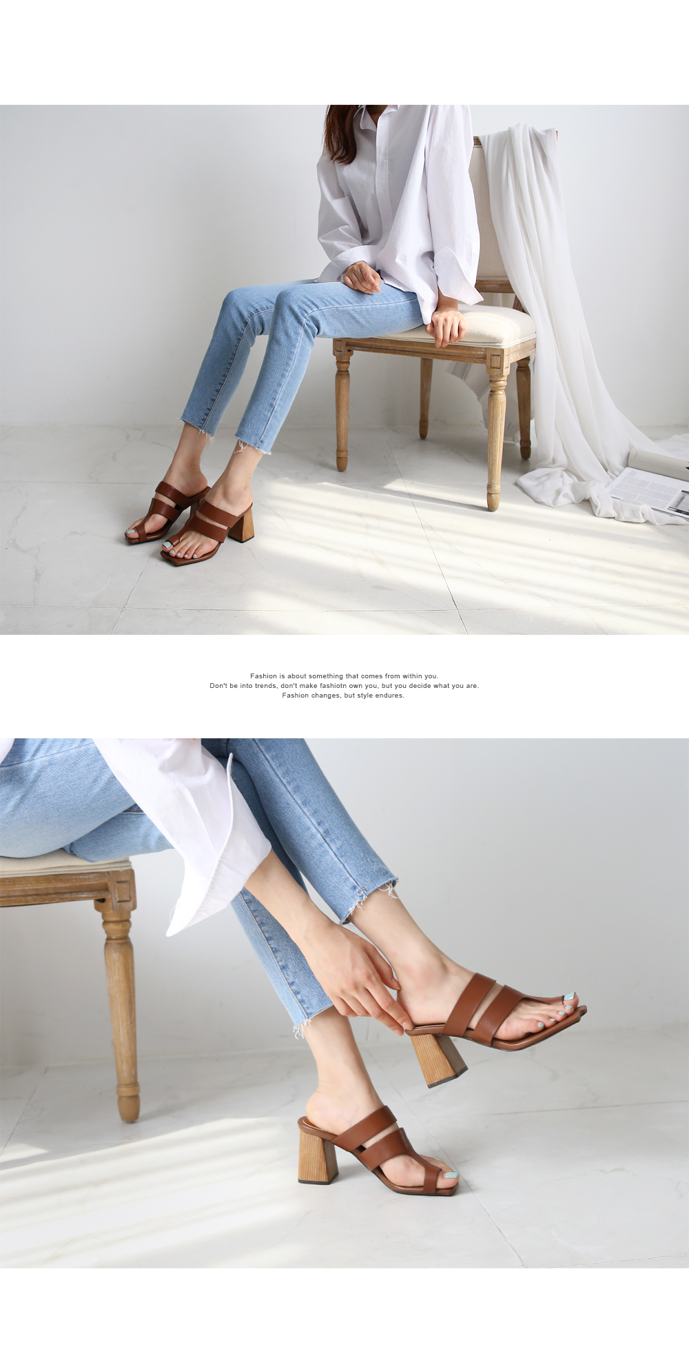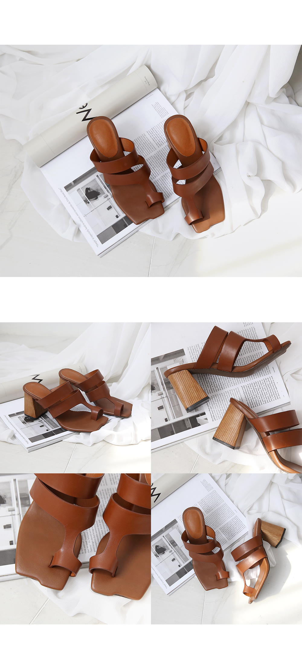 DETAILS - 소재 : 인조소가죽 우드굽 - 컬러 : brown,black - 피팅감 : 정사이즈 / 무게 : 보통인편 - 착화감 : 뒷꿈치 쿠션으로 편안해요 - 모델피팅 : 235
