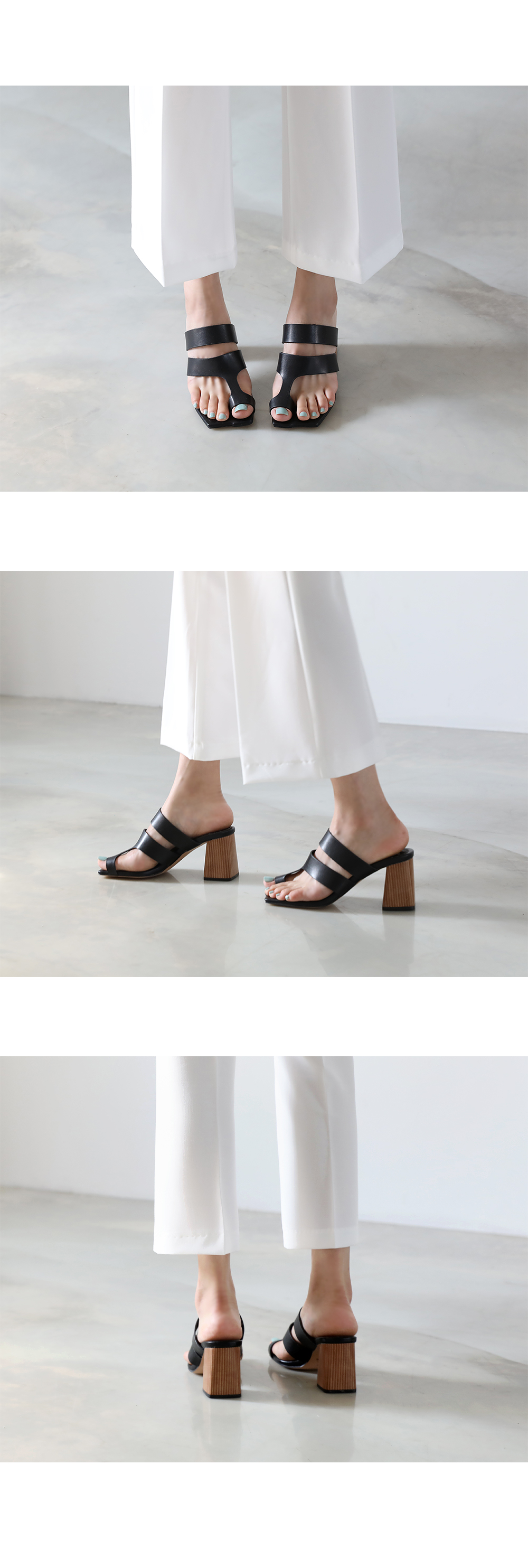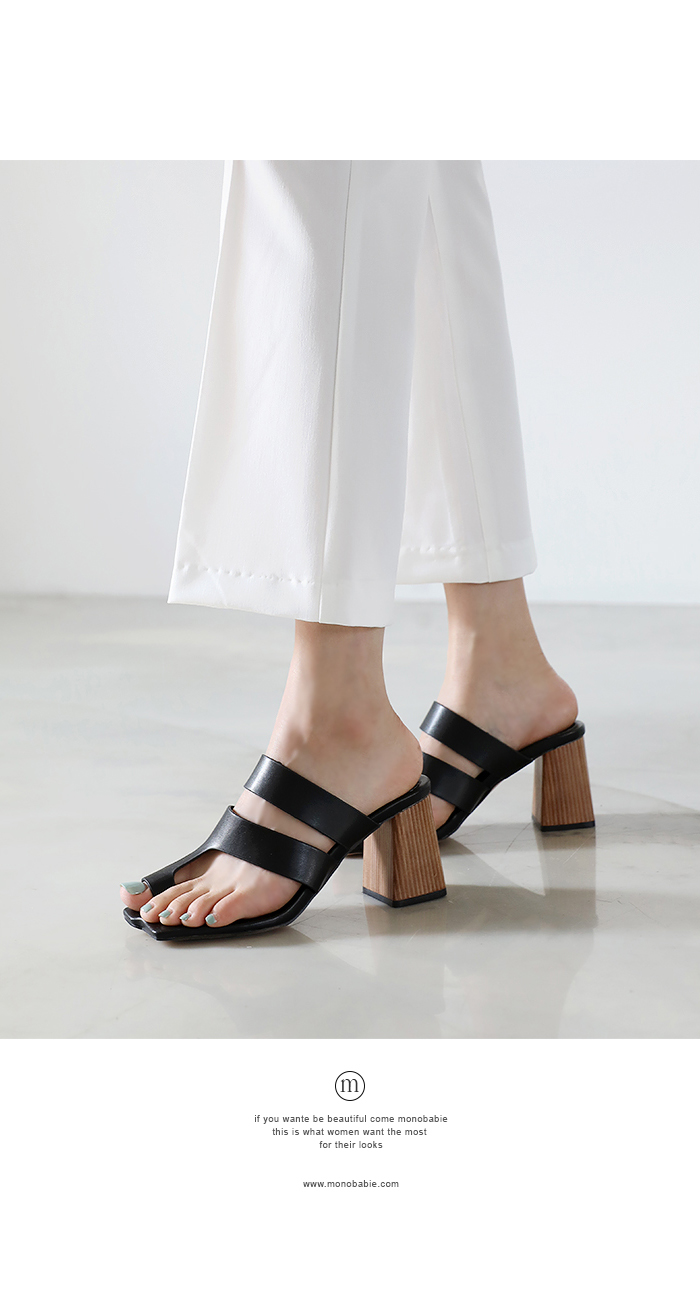 무드톤에 우드굽이 자연스럽게 어우러져 앞 밑창이 유니크하게 디자인 된 전체적으로 스퀘어진 이미지의 미들굽 샌들입니다.