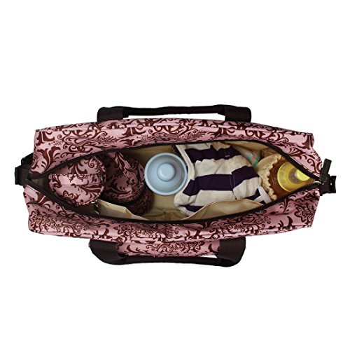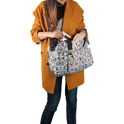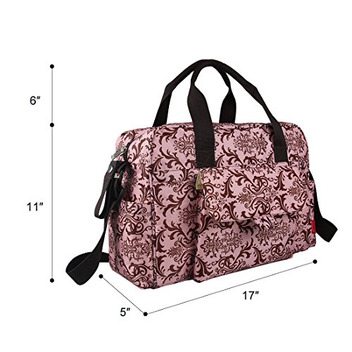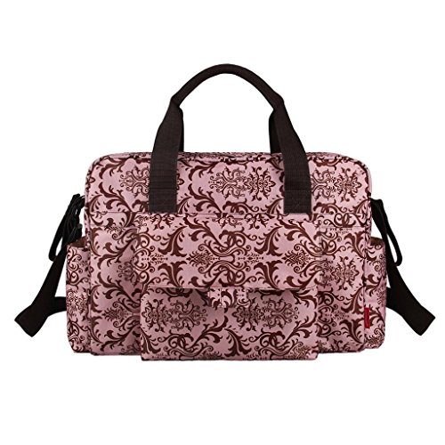 - Feature : Made of waterproof 600D microfiber,only 1.2 pound(0.5kg);with water repellent styles effect;cleaning easy. / Large roomy diaper bag ,size:L17" x H11" x W5";4 external pockets:one front pocket, one large back pocket and two side pockets which you can put feeder bottle,wet tissue,small toy and so on. Main pockets has 6 interior pockets to help mom organize baby things, diaper bag organizer is available to put inside / Fully equipped with accessories,5 pieces set of diaper bag, a large roomy diaper bag , changing pad, PVC bag which you can put wet clothes, bottle bag and pacifier bag. / Adjustable strap with shoulder pad keep mummy and daddy's shoulders away from hurt and uncomfortable / With stroller clasps are connecting diaper bags and stroller. Soft changing pad keep baby away from cold and wet floor