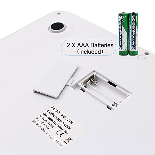 AUTOMATIC FUNCTION - Auto-On, immediate readings as soon as you step on the Bathroom Weight Scale; Auto Calibrated; Auto Power-Off; Runs on 2 AAA Batteries (included)
