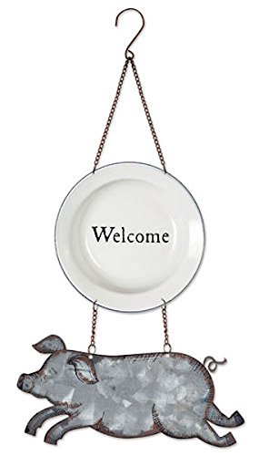 - Galvanized metal art features piggy, enamel covered plate reads: Welcome