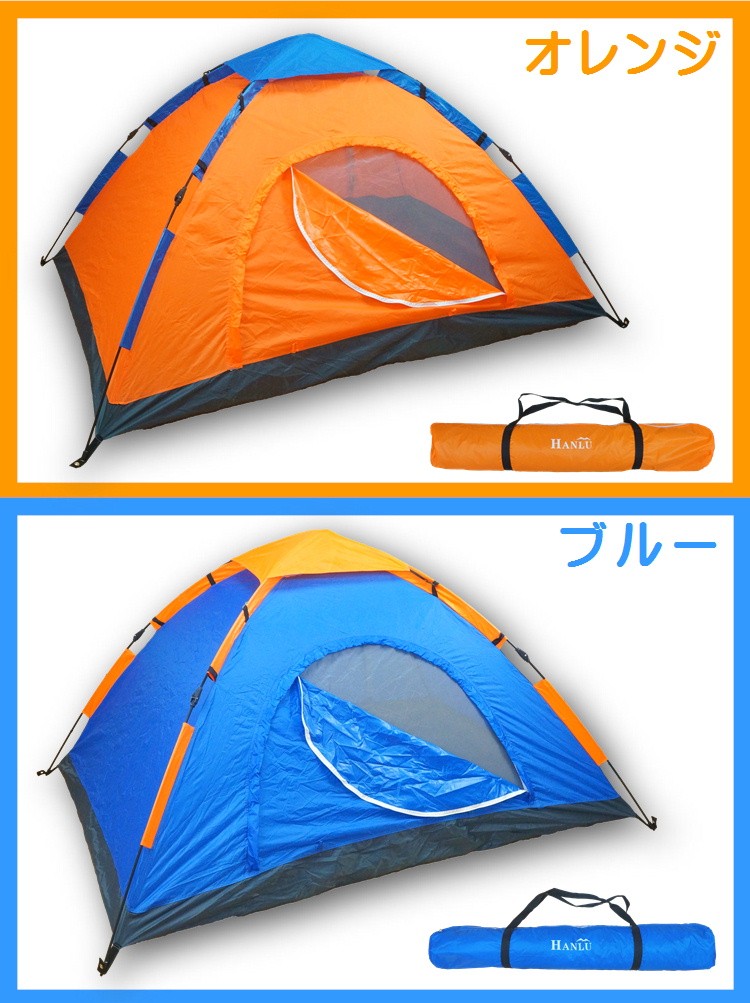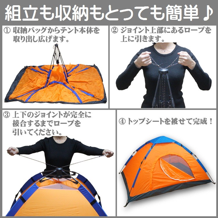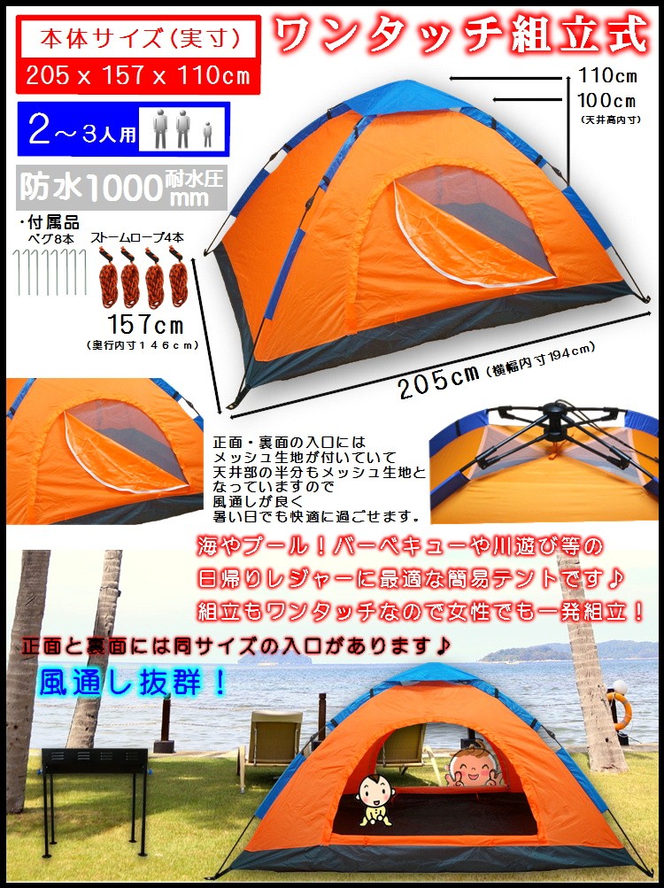 ワンタッチで組立てが出来る簡易テントです。広げて紐を引くだけで完成です。今までの骨組み作業がなく女性一人でも楽々完成!キャンプ、バーベキュー、海水浴、プール等のイベントに最適な簡易テントです。■色 :オレンジ・ブルー■素材 :ポリエステル■防水 :耐水圧1000mm■重量 :約2.0Kg■サイズ:205cmX157cmX110cm(実寸完成サイズ)■サイズ:194cmX146cmX100cm(実寸完成内寸サイズ)■収納サイズ:直径13cmX92cm■定員 :2~3人■生産国:中国※製作時の汚れ等がある場合がございますので、ご了承ください