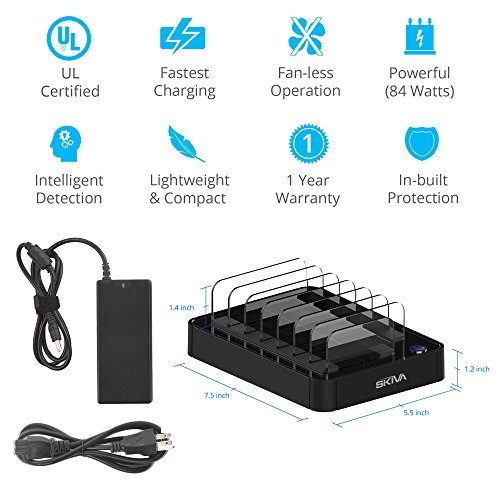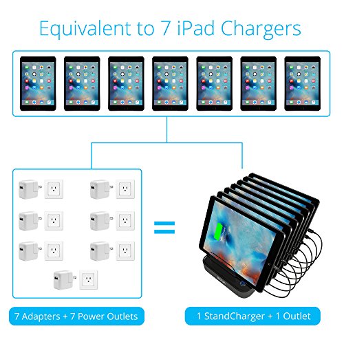 Stand: Industry's first 7-port 84 Watt (7 X 2.4 Amps) Rapid USB Wall charger comes with a built-in stand that has enough room to support 7 devices. Its the best multi USB powerhouse charging station to be used at Home, Office, Café, School, Hospitals etc.