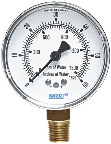 WIKA 9851704 Capsule Low Pressure Gauge, Dry-Filled, Copper Alloy Wetted Parts, 2-1/2" Dial, 0-60"WC (mm WC) Range, +/-1.5% Accuracy, 1/4" Male NPT Connection, Bottom Mount