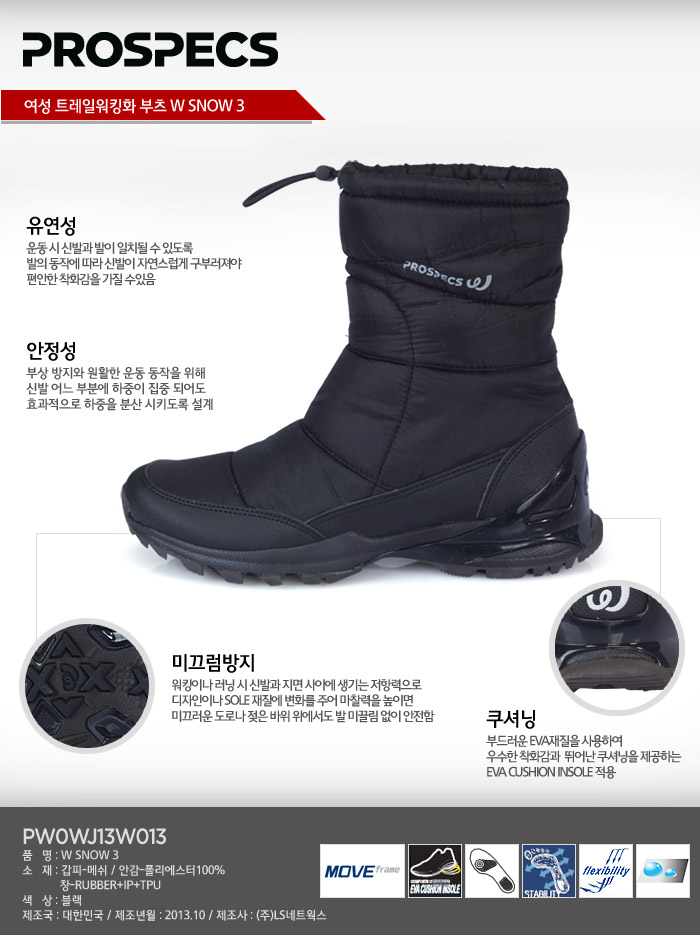 モデル:W SNOW 3 素材: -アッパー:メッシュ -上味:ポリエステル100% -ソール:RUBBER+IP+TPU カラ-:ブラック サイズ(cm):23/24/25 * サイズは測り方によって誤差が生じる場合があります。 * モニタ-やブラウザの設定によって実際の商品と色味が若干異なる場合があります。