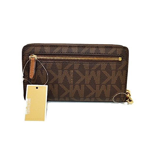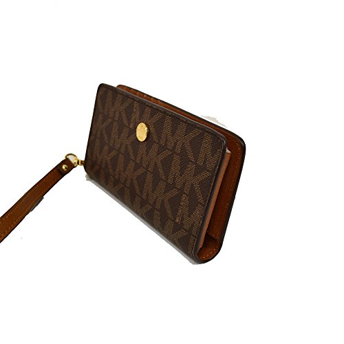Product Description Michael Kors Jet Set Travel Slim Tech Wristlet Phone Clutch Brown Signature Photo ID, 5 c.card spaces, bill spaces, place for cell phone. Fits I phone 6 ( not plus sizes). 6" removable wrist strap . Rear zip pocket 0