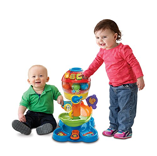There's so much to explore with the Spin and Learn Ball Tower by VTech. Drop the colorful balls into the top of the ball tower and listen as it identifies the color or the animal on the ball. Once the balls are inside, twist the knob and watch as they spin around inside the clear dome. Your little one will then hear fun sounds and phrases as the balls fall onto the track. As the balls spiral down the track, little learners can build motor skills by moving the gates to start and stop balls along the way. Four light-up buttons introduce numbers, colors, insects and playful songs. Drop, spin and learn! Requires 2 AAA batteries (batteries included for demo purposes only; new batteries recommended for regular use). Intended for ages 9 months to 3 years.Feature