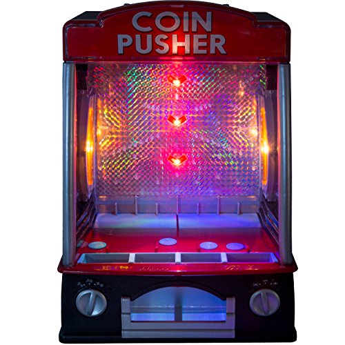 Mini Arcade Machine - Electronic Coin Pusher with Lights & Sounds - Works with Real Pennies or 300 Included Coins -- A remake of the classic arcade game that guarantees fun for kids and adults both at home and at work! The mini arcade game comes with 300 plastic coins; real pennies can also be used to play the game. The Coin Pusher lights up and plays music (switchable)--just like the real arcade game. To play, simply drop pennies or plastic coins at the right time to push all the pennies forward onto the lower shelf and, in turn, pushing the pennies on that level over the edge and win a prize! Comes with an anti-tilt alarm to foil underhanded attempts to cheat the machine. Fun for both kids and adults! Requires 4 D batteries / Batteries not includedFeature