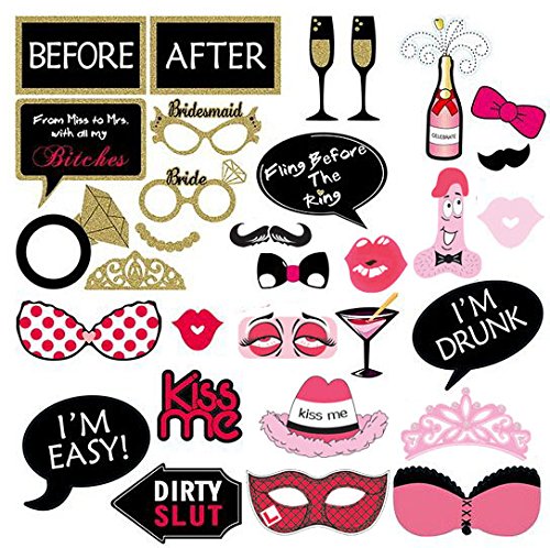 Losuya 31pcs Hen Party Photo Booth Props Wedding Photobooth Props Decorations Bachelorette Girls Night Out Games DIY Kit Funny Moustache, Ring, Glasses, Crown,Before, After Favor